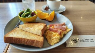 阪急高槻市駅の改札を出てから徒歩約1分位のところにあり、しかも朝6時30分から開いているという素晴らしいお店です。からふね屋の定番商品写真を見てわかる通り、theモーニングですが、オレンジがいてくれるのが僕には感動です!スクランブルエッグは...